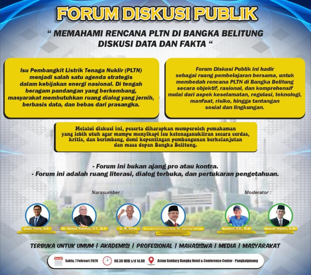 Forum Unit Kinerja Sarjana Bangka Belitung (Fokus Babel) bekerja sama dengan Kantor Berita Online Bangka Belitung (KBO Babel) akan menggelar Forum Diskusi Publik bertajuk “Memahami Rencana PLTN di Bangka Belitung: Diskusi Data dan Fakta”, yang dijadwalkan berlangsung pada Sabtu, 7 Februari 2026, di Aston Emidary Bangka Hotel & Conference Center, Pangkalpinang.