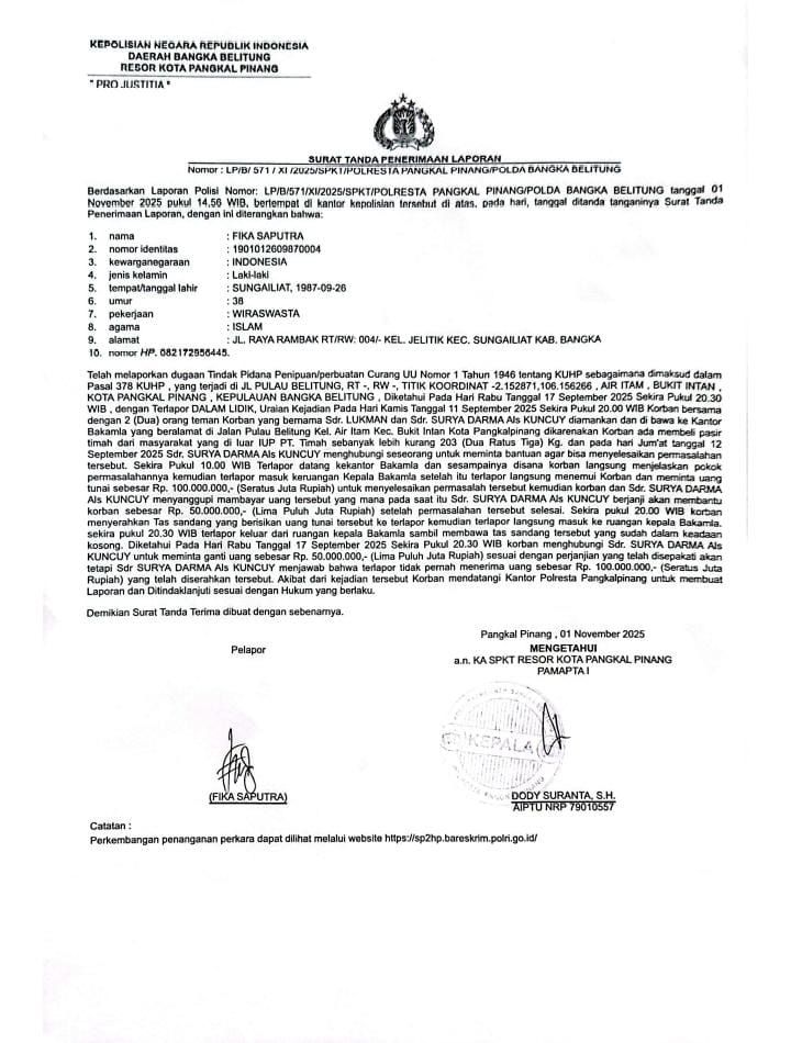 Laporan kepoliaian itu dengan nomor : LP/B/ 571 / Xl 12025/SPKT/POLRESTA PANGKAL PINANG/POLDA BANGKA BELITUNG, tanggal 01 November 2025 pukul 14.56 WIB. bertempat di kantor kepolisian tersebut di atas, pada hari, tanggal dltanda tanganinya Surat Tanda Penerimaan Laporan, dengan inl diterangkan bahwa: