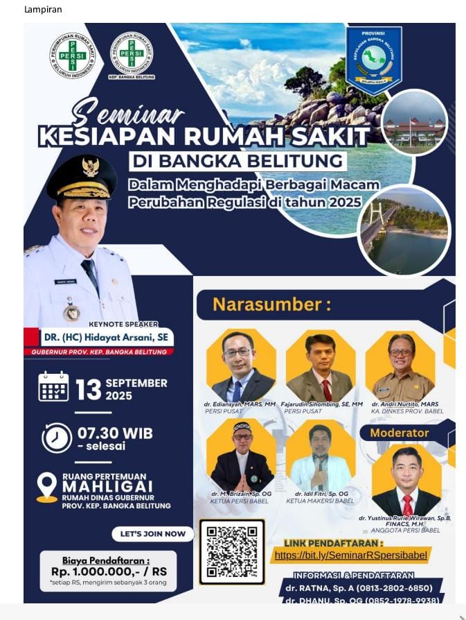 Pangkalpinang|Babelwow.com – Perhimpunan Rumah Sakit Seluruh Indonesia (PERSI) Wilayah Kepulauan Bangka Belitung menggelar seminar bertajuk “Kesiapan Rumah Sakit di Bangka Belitung dalam Menghadapi Berbagai Macam Perubahan Regulasi di Tahun 2025”, Sabtu (13/9/2025). Acara yang berlangsung di Ruang Pertemuan Mahligai Rumah Dinas Gubernur Kepulauan Bangka Belitung ini menghadirkan berbagai narasumber berkompeten di bidang kesehatan.