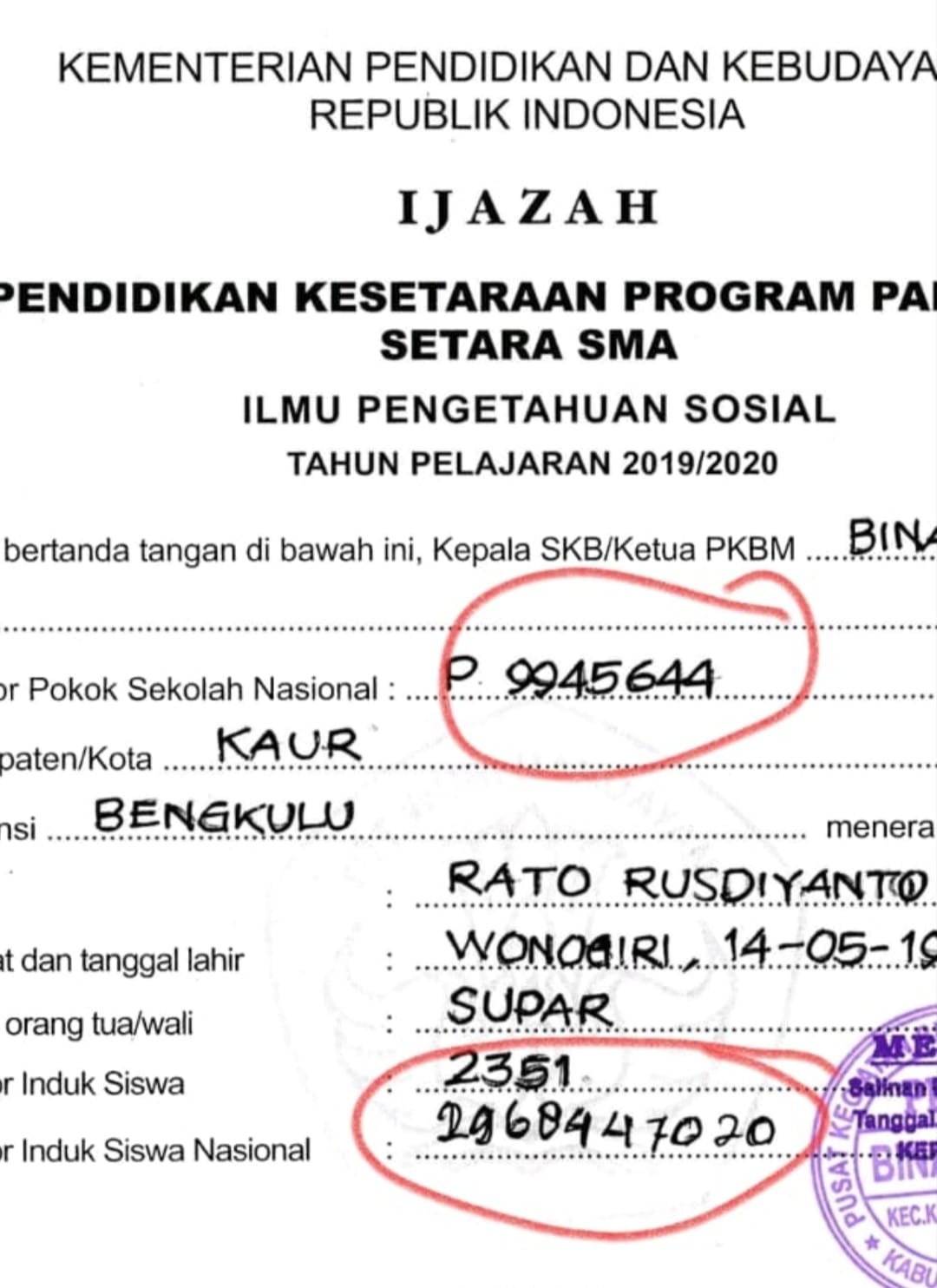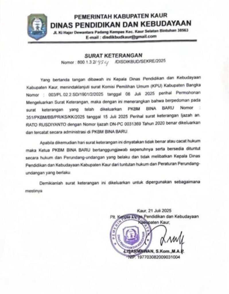 Berbeda halnya dengan surat kedua dikeluarkan pihak Disdikbud Kabupaten Kaur, isinya menerangkan perihal surat keterangan ljazah an RATO RUSDIYANTU dengan Nomor ljazah DN-PC 0031369 Tahun 2020 benar dikeluarkan dan tercatat secara administrasi d PKBM BINA BARU.