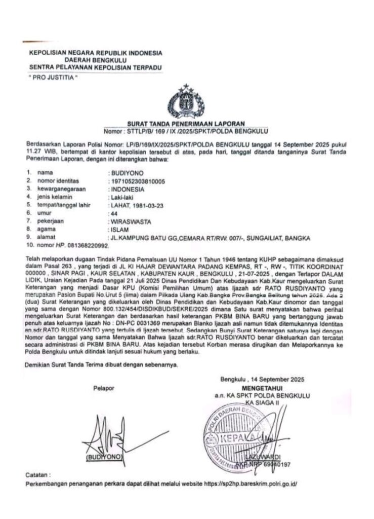 “Hari ini kita telah melaporkan saudara Rato Rusdiyanto ke Polda Bengkulu terkait laporan dugaan pemalsuan ijazah paket C dimiliki yang bersangkutan saat mencalonkan diri sebagai bupati Bangka di Pilkada Ulang 2025,” kata Budiyono dalam siaran persnya.